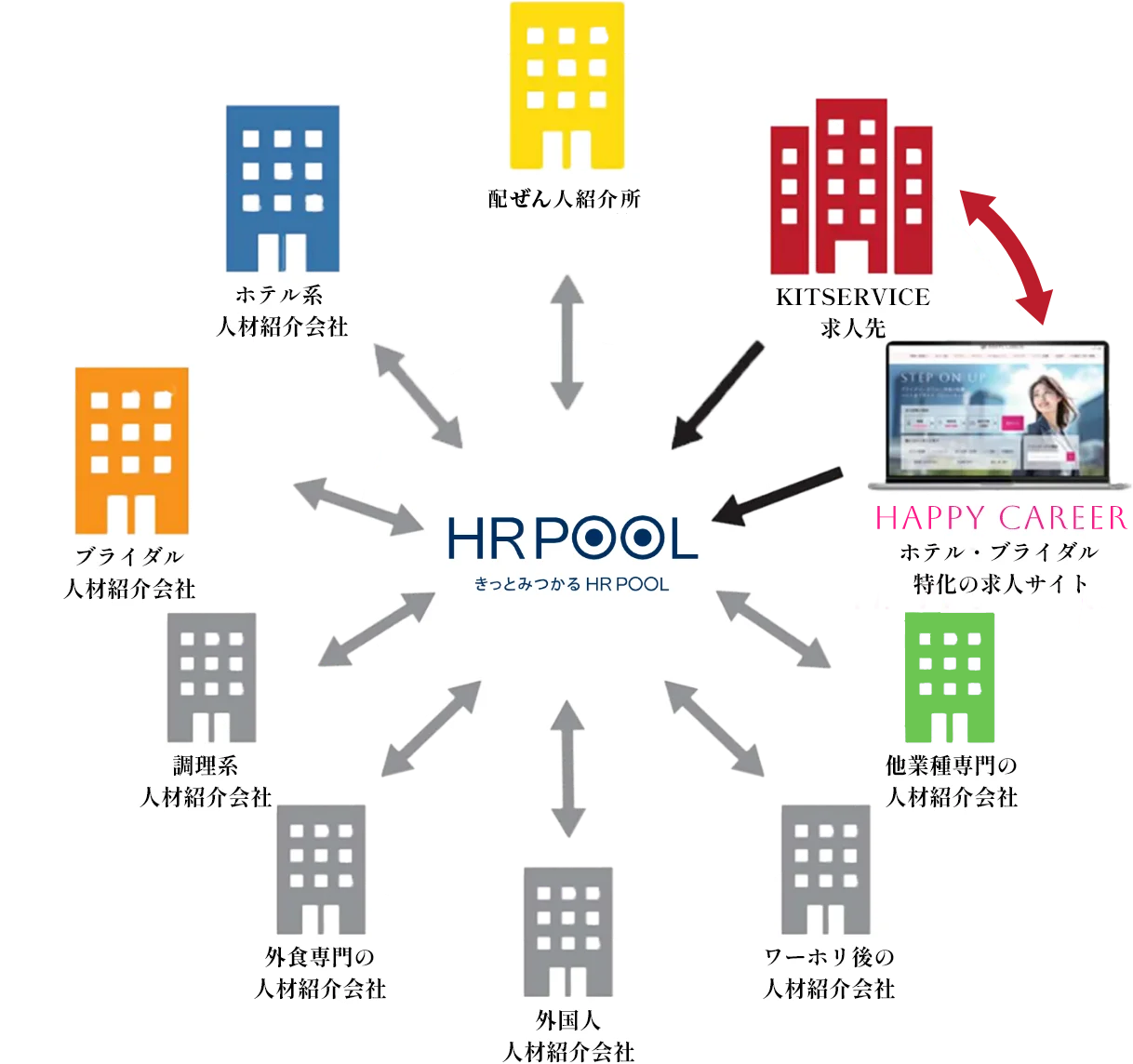 HR POOLには、ホテルブライダル飲食業界以外の人材会社にもご参画頂いています。他業界で就職を希望する人材の紹介業務が、協業で可能になります。