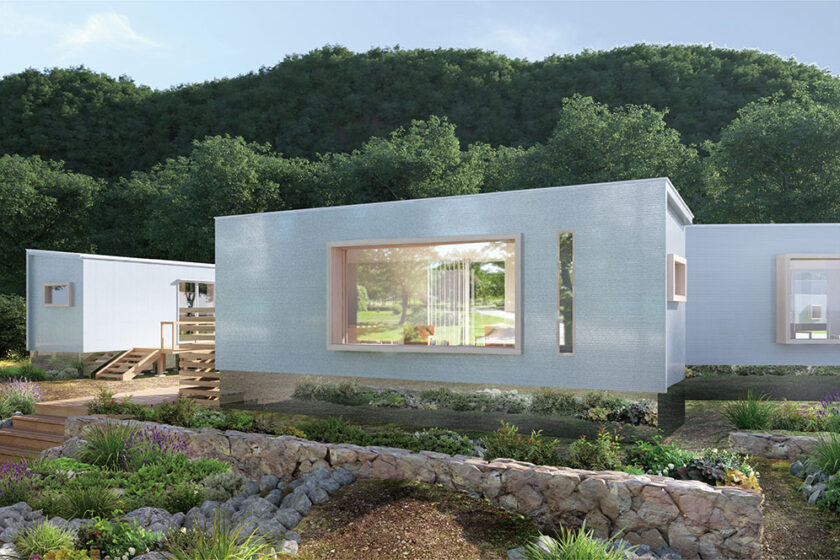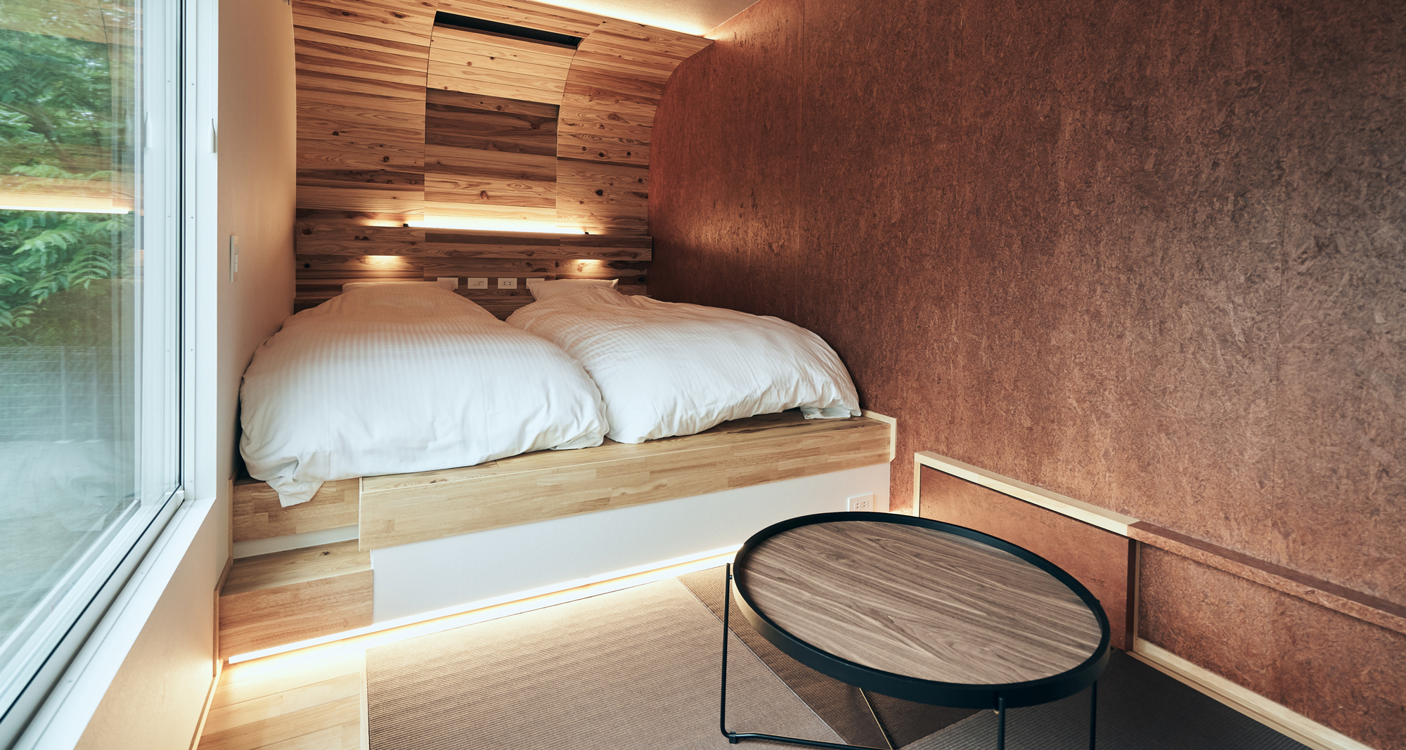 五感で富士山麓を感じるBLANC FUJIのヴィラタイプの客室は、自然を最大限に満喫できるように配置。直線と曲線による独特なフォルムで、自然を身近に感じながらも、しっかりとプライベート空間も守られる設計となっています。大きな窓から自然の景色を眺め、川のせせらぎを感じながら、ゆったりとした時間をお過ごしいただけるホテルです。