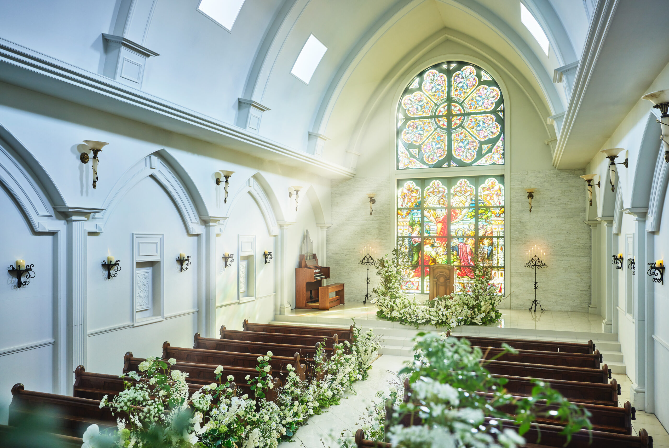 郡山駅西口から車で15分、福島県中通り南に位置する結婚式場『ブライマリーコート』。美しい英国風の街並みの中に気品漂うチャペルが佇んでいます。中に入って目を引くのは煌めくステンドグラス。かつてドイツで作られアメリカに渡り、時を経て現在このチャペルで愛を誓うふたりを見守っています。伝統あるステンドグラスに見守られた挙式の後は、英国の華やかな雰囲気が漂うバンケットルームでの披露宴。気品ある調度が歓談の時を彩ります。披露宴に華を添えるのは、一流シェフによる極上の料理。「心と体に優しい料理」をコンセプトにした料理に、ふたりとゲストへの心遣いが感じられます。美しい空間と美食で憧れの正統派ウェディングが叶う結婚式場です。